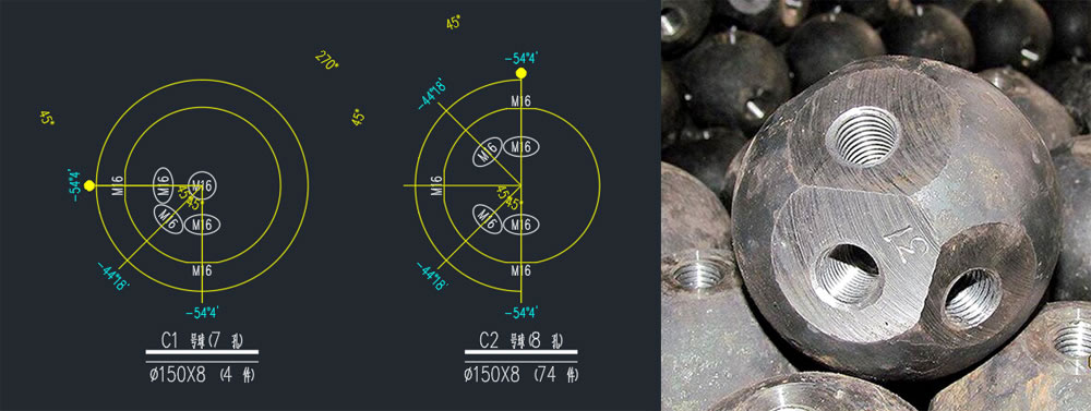 1.鋼管與錐頭(或封板)采用E43焊條焊接,焊縫要求飽滿,不得有夾渣、氣孔、咬肉、未焊透等缺陷。鋼板與球焊接時,球應預熱150~200?o?C,方可施焊。
